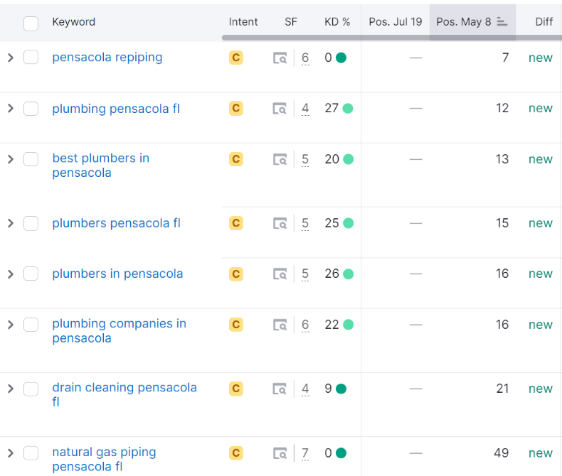 The results were substantial. The keyword "Pensacola repiping" rose from rank 100 to 7, significantly increasing visibility and traffic. Other keywords, such as "Plumbing Pensacola FL" and "Best plumbers in Pensacola," also saw major ranking improvements.