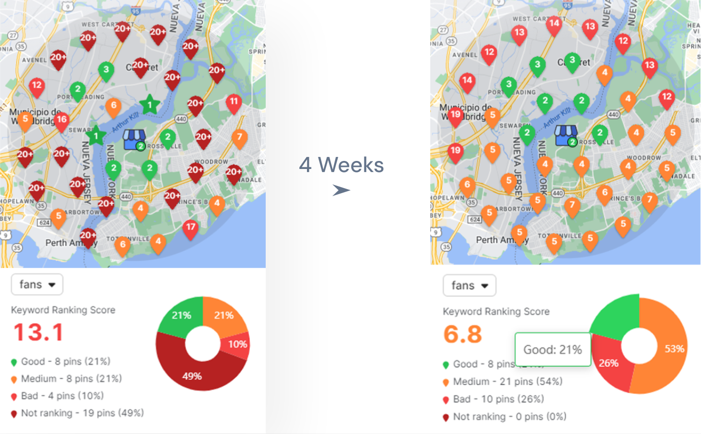 With RankONE, the client added weekly Q&A posts to their Google Business Profile, targeting relevant keywords and engaging potential customers. To analyze the results, pins were placed to represent nearby locations, and a local SEO heatmap was used to track improvements in search rankings over a 4-week period.